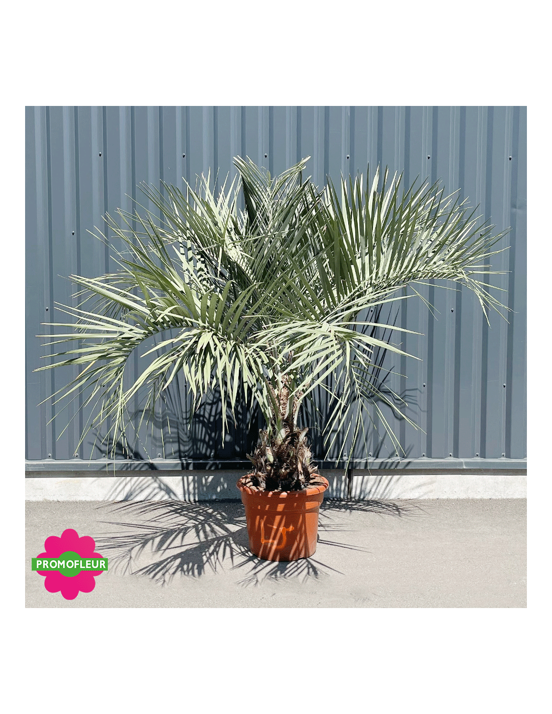 Ce Palmier qui mesure 150 cm de hauteur environ provient d’Espagne. Il a une résistance impressionnante au froid (résiste au gel jusqu’à -15°C) mais aussi à la sécheresse. Il peut s’acclimater partout en France sauf dans les sols trop acide (terre de bruyère).