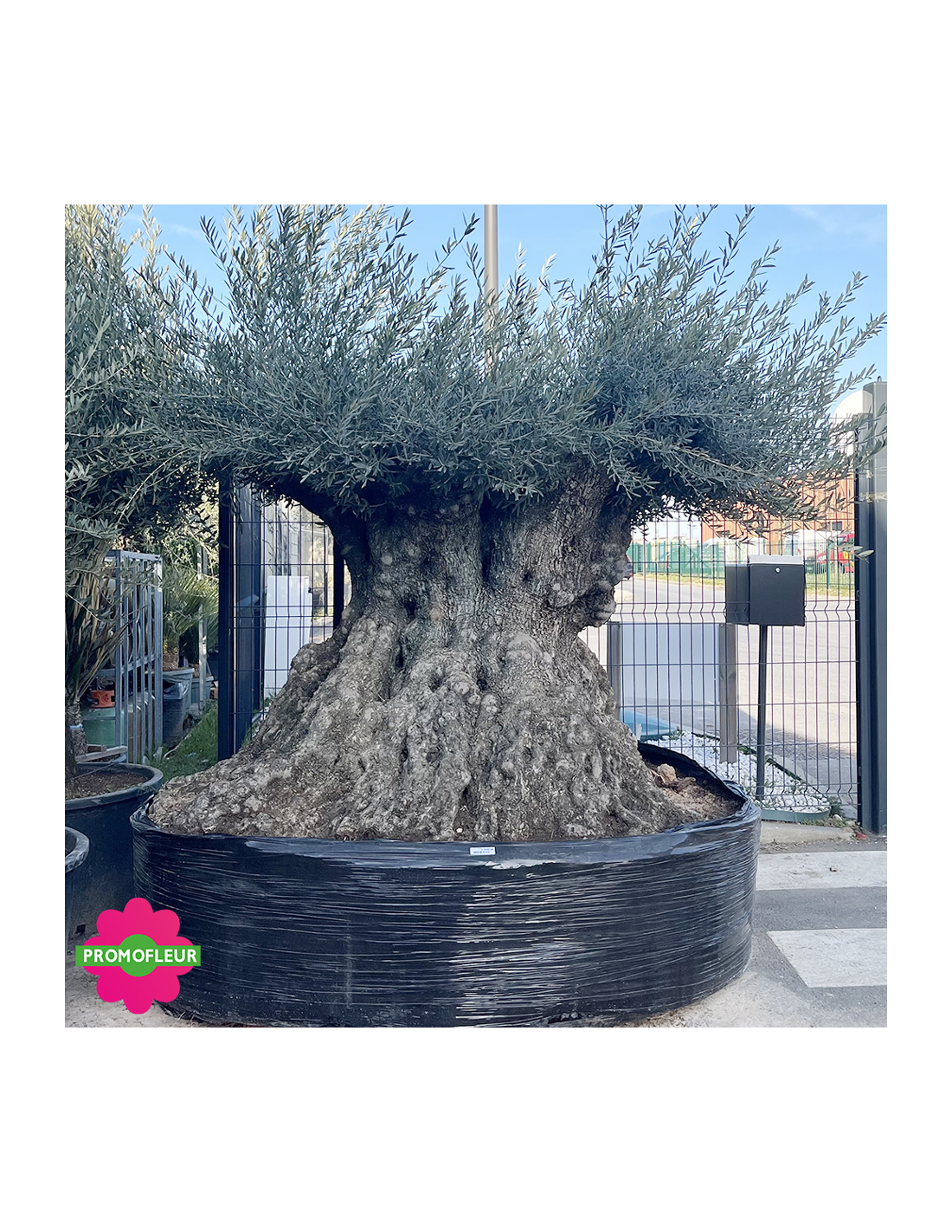 Cet Olivier "Olea europaea" (origine Espagne) a un tronc imposant, rugueux et noueux qui mesure 275 à 300 cm de circonférence.