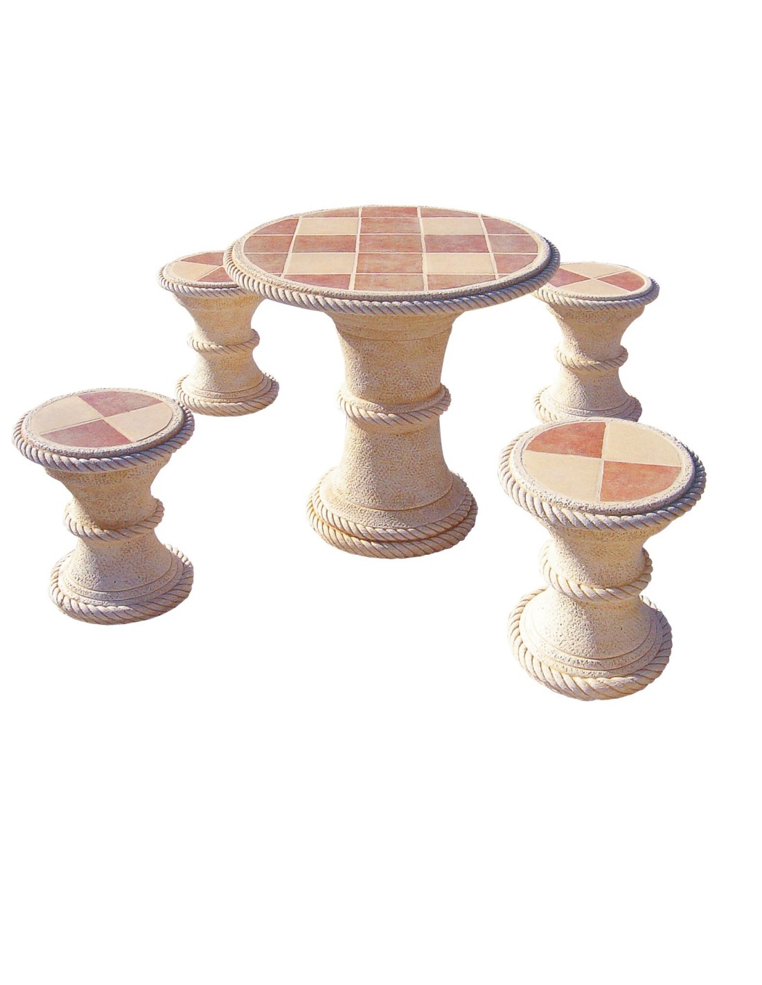 Ce salon de jardin MANGO Ocre avec Carrelages est composé d'une table ronde de diamètre 80 cm et de hauteur 74 cm et de 4 tabourets ronds de diamètre 40 cm et de hauteur 45 cm. D'un poids total de 265 kg, le salon de jardin en pierre MANGO ne s'envolera pas au premier coup de vent ! La structure métallique à l'intérieur des éléments et le procédé de fabrication du fabricant espagnol Framusa lui assure une résistance dans le temps et aux variations climatiques (pluie, gel et aux UV) !
